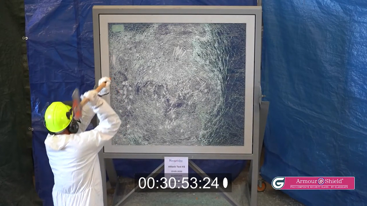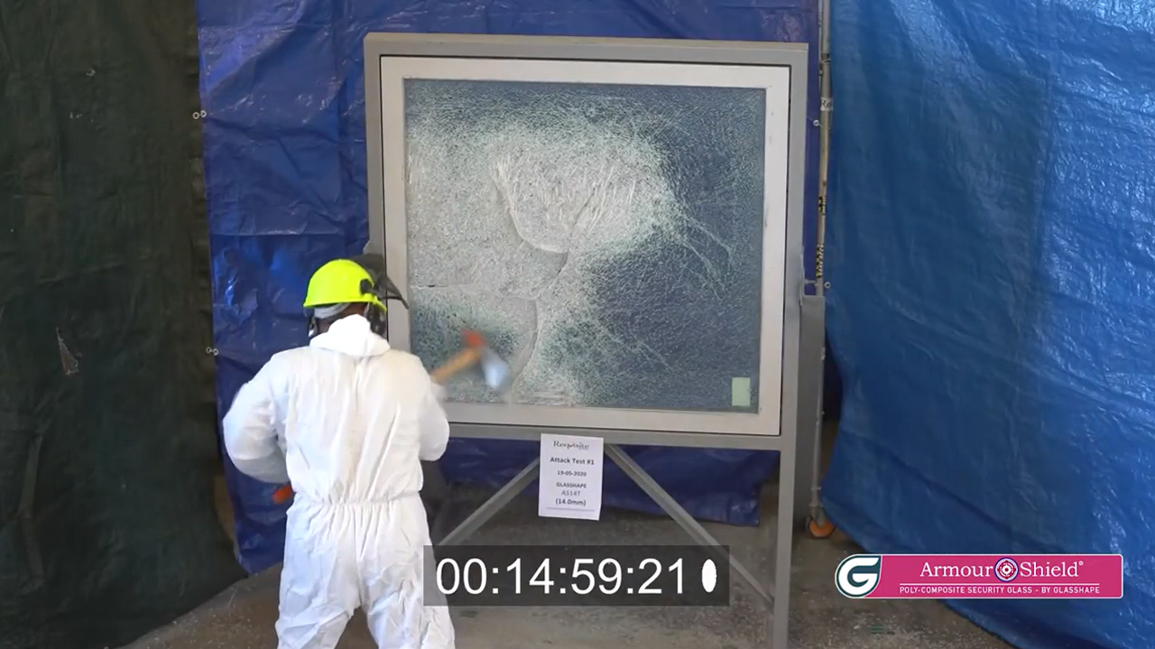 ArmourShield® is a polycomposite-glass laminate that maintains the appearance of normal glass while offering significant protection from deliberate, sustained attack making it ideal for armoured glass requirements. Attack weapons simply bounce off the armoured glass. In the event the window glass surface is compromised, the tough inner-core of the polycomposite remains un-penetrated protecting individuals and property inside.