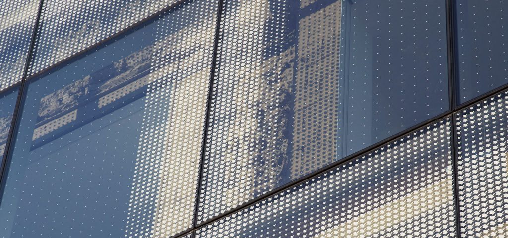 Opacity, translucency & ink layer thickness can be precisely manipulated to deliver required SHG and VLT values. This process also controls light diffusion & transmission. Using ink to deliver these goals vs. heavy building envelopes could deliver significant production and ongoing maintenance savings. Ink printed onto the exterior surface mitigates reflected heat (available in black and white only).
